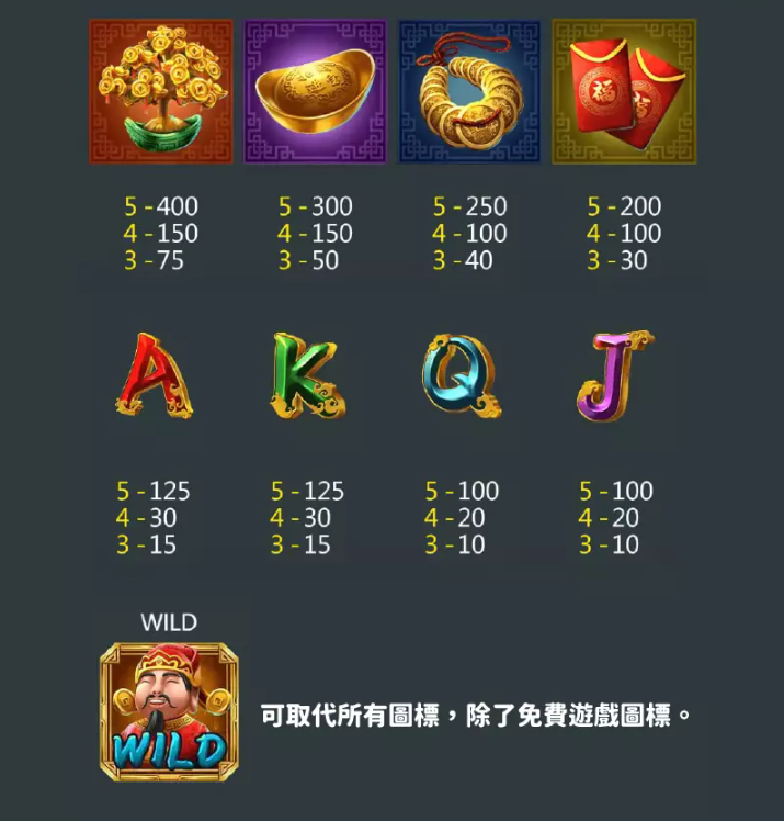 財神到老虎機擁有243種連線得分方式,從最左軸開始,往右連續三軸以上相同圖標即可獲得贏分。這多元的得分線方式,使得贏得獎金更加靈活。