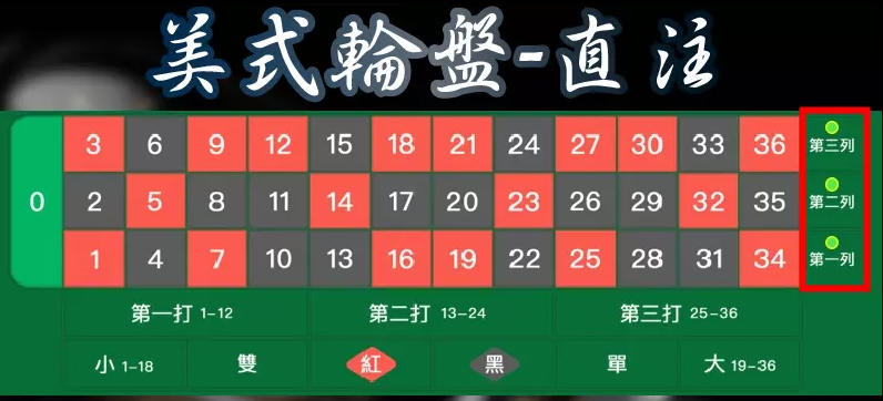 - 列注: 每列包含12個號碼,可對「第X列」進行下注。例如:第一列包括1、4、7、10、13、16、19、22、25、28、31、34等共12個數字。若下注第一列,只要結果出現在第一列的任何數字,即可獲勝!