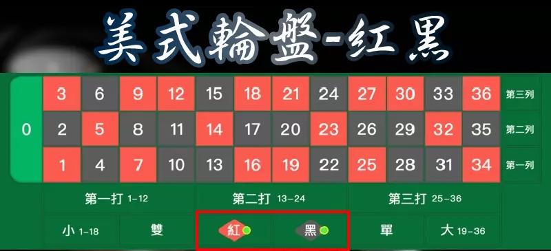 紅黑:在桌面上標有紅色和黑色的位置進行下注。如果開出0則所有下注皆失敗。例如:下注所有紅色格子的數字或所有黑色格子的數字。