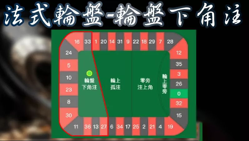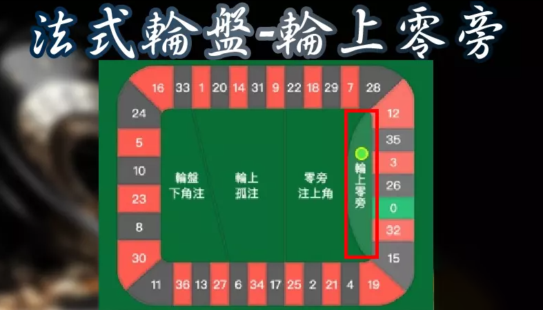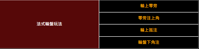 - 法式輪盤:也稱為歐式注盤,可以視為對美式注盤的變化,它將美式注盤的部分組合打包後,提供了不同的下注玩法。