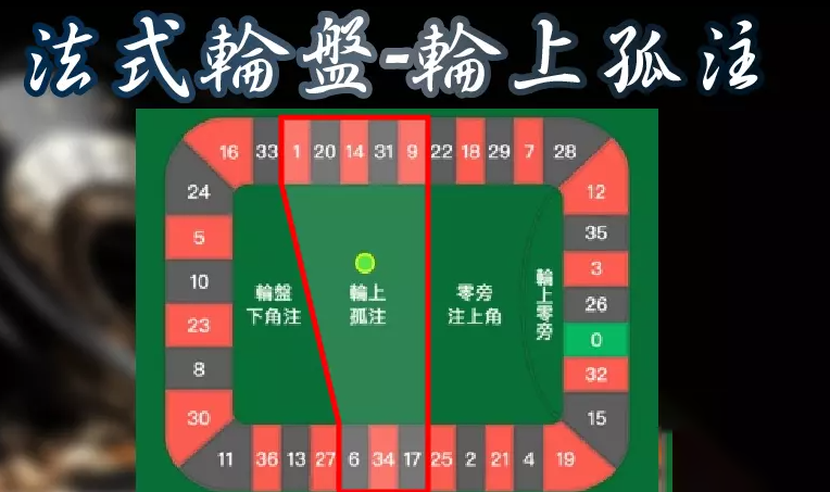點擊輪盤上的孤注區域,對以下區域組合進行下注。即投注輪盤台上的1、6、9、14、17、20、31、34號各一注。