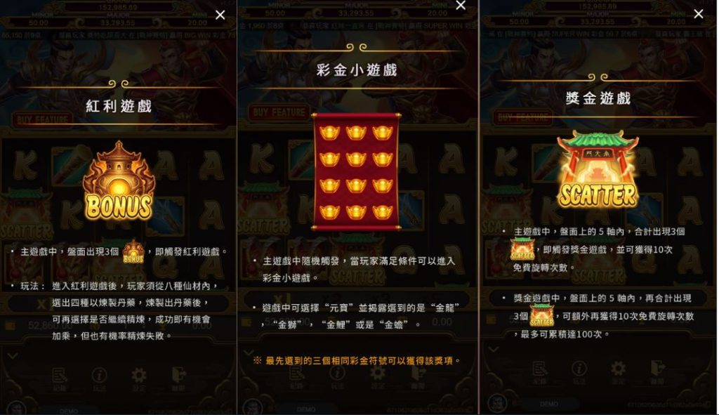 當畫面上出現三個火焰圍繞的「煉丹爐」BONUS符號時,玩家將進入紅利遊戲。在這個遊戲中,玩家需要進行選擇,選出四種仙材來煉製丹藥。每一種仙材都有不同的獎勵潛力,這四種材料的搭配將影響最終的煉丹結果和玩家獲得的獎勵。